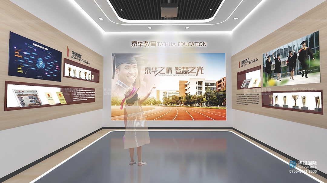 泰華教育展廳設計理念,華竣從泰華辦學的情·懷,情·敬,情·競,情·境,情·景入手,傾情呈現泰華教育的創新辦學模式,從多角度、多面孔、全方位、跨時空展示泰華教育模式和成果,讓參觀者既能鳥瞰全景,又能觀照細部,獲得整體而不失深刻的印象。