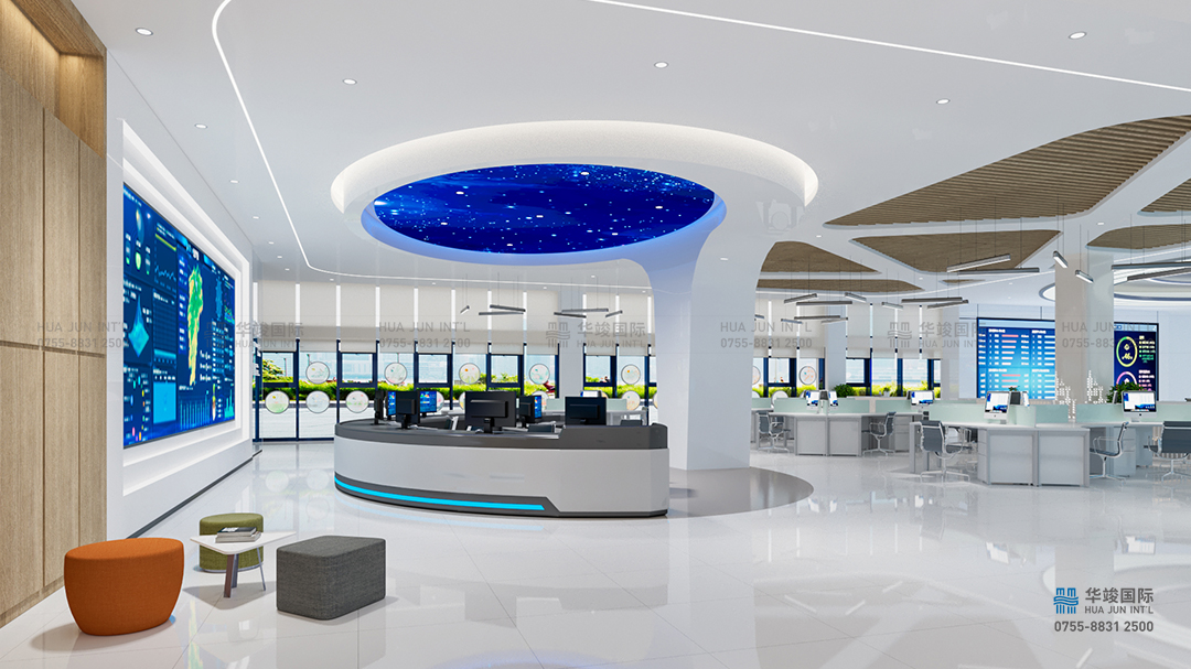 以現(xiàn)代簡約的空間構(gòu)建手法,以氣象和數(shù)據(jù)為空間元素,打造簡約大氣,重點突出的前廳接待空間。頂部天花用氣象的 LOGO勾勒出整體天花的設(shè)計感,墻面發(fā)光的數(shù)據(jù)表達大數(shù)據(jù)的元素,同步中間光效層層包裹中嵌入一塊LED大屏,播放江西智氣象空間全面的視頻介紹片。有時候也可以作為歡迎屏,切換歡迎詞來使用。