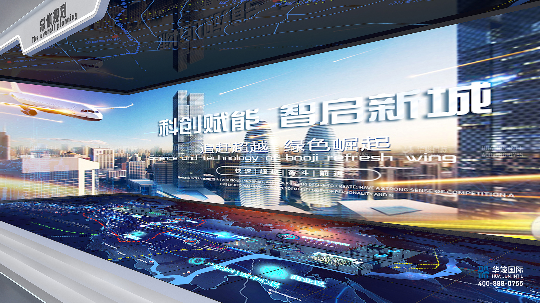 總體規(guī)劃主要內(nèi)容為一心/兩軸/三組 團的總體規(guī)劃布局,利用沉浸式數(shù)字沙盤體驗數(shù)字科技感的空間氛圍,使參觀者身臨其境,切身融入到高新區(qū)科技新城的場景之中。
