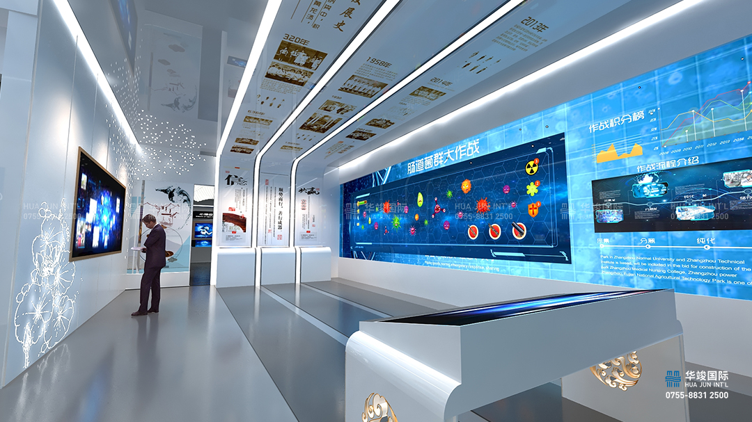 來到腸道菌群區域,頂部世界腸道菌群發展史一路向前,地圖可以實時更新世界是每個地域最新的醫學研究成果與醫療模式,參觀者可以通過互動平臺,詳細了解鴻慈的臨床案例,主動的與數字地圖產生交互,了解自己感興趣的最新醫學信息。
