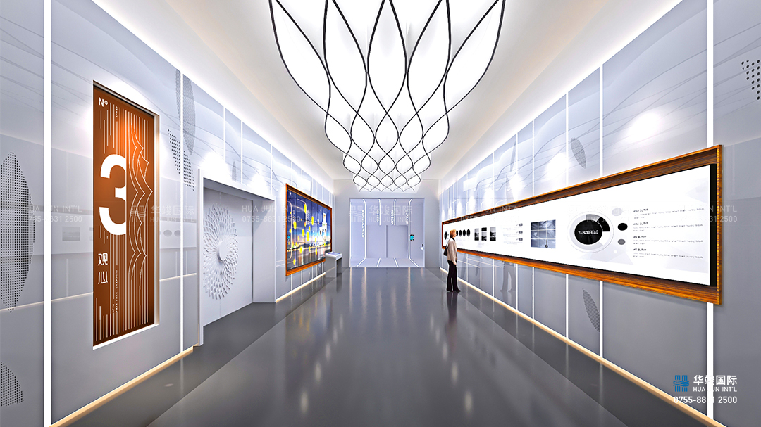 理念實力廳整體以健康中國理念為主,展現了鴻慈公司在國家健康大背景下順勢而為,全面展示生命健康理念、公司概況、專家團隊和核心技術等。設計上,天花頂采用祥云元素,地面水紋層層蕩漾,突出山水意境,表現科技和自然的融合,整體風格大氣舒展。