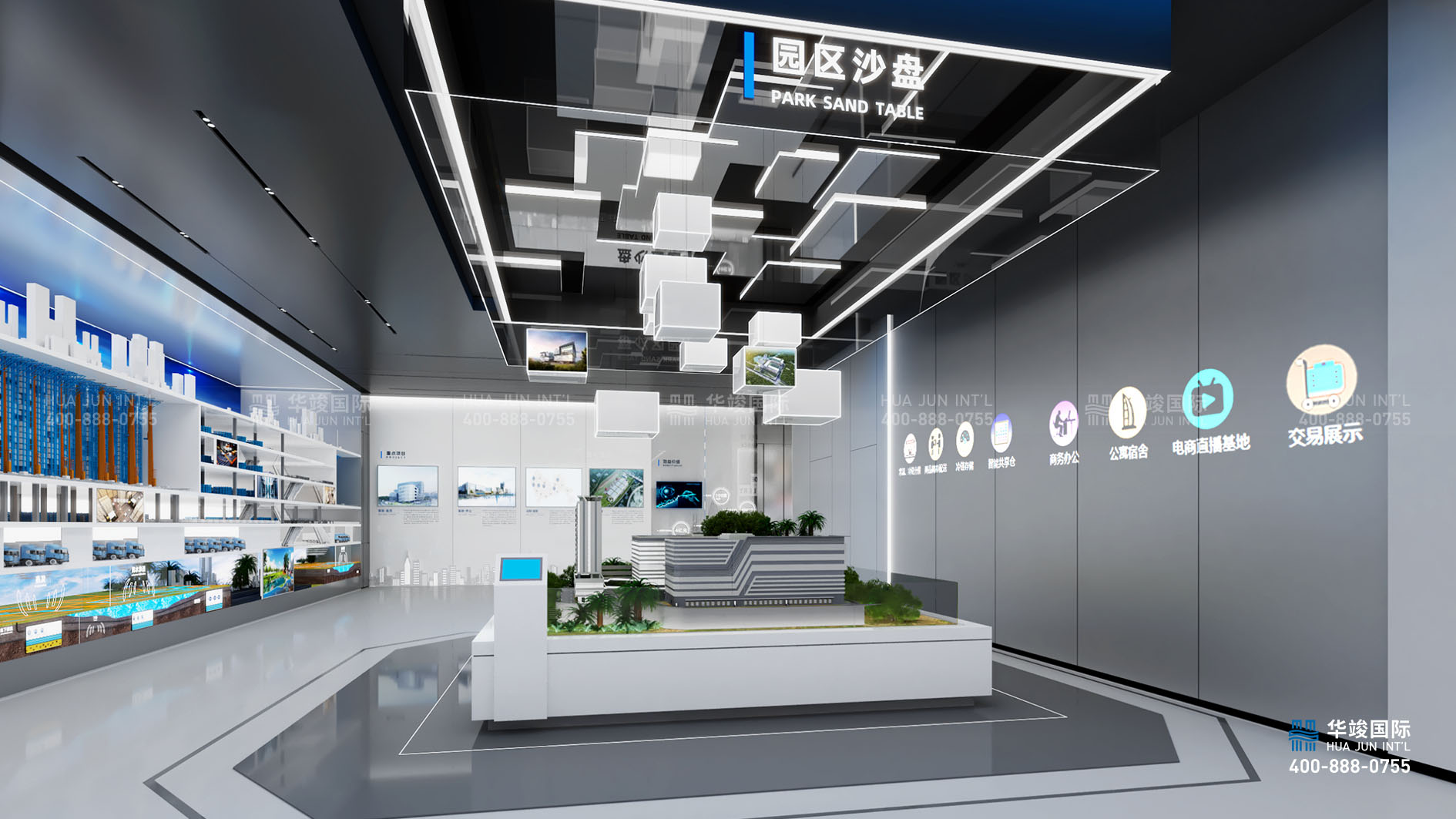 數(shù)智賦能 通達無限:展區(qū)第二大空間,中心點匯聚園區(qū)實體沙盤,打造醒目視覺核心,形成了極具凝聚力的中導空間,使各分區(qū)既相互獨立又串聯(lián)一體,增加參觀動線的多樣性,形成開放包容的姿態(tài)向四面八方自然延展。